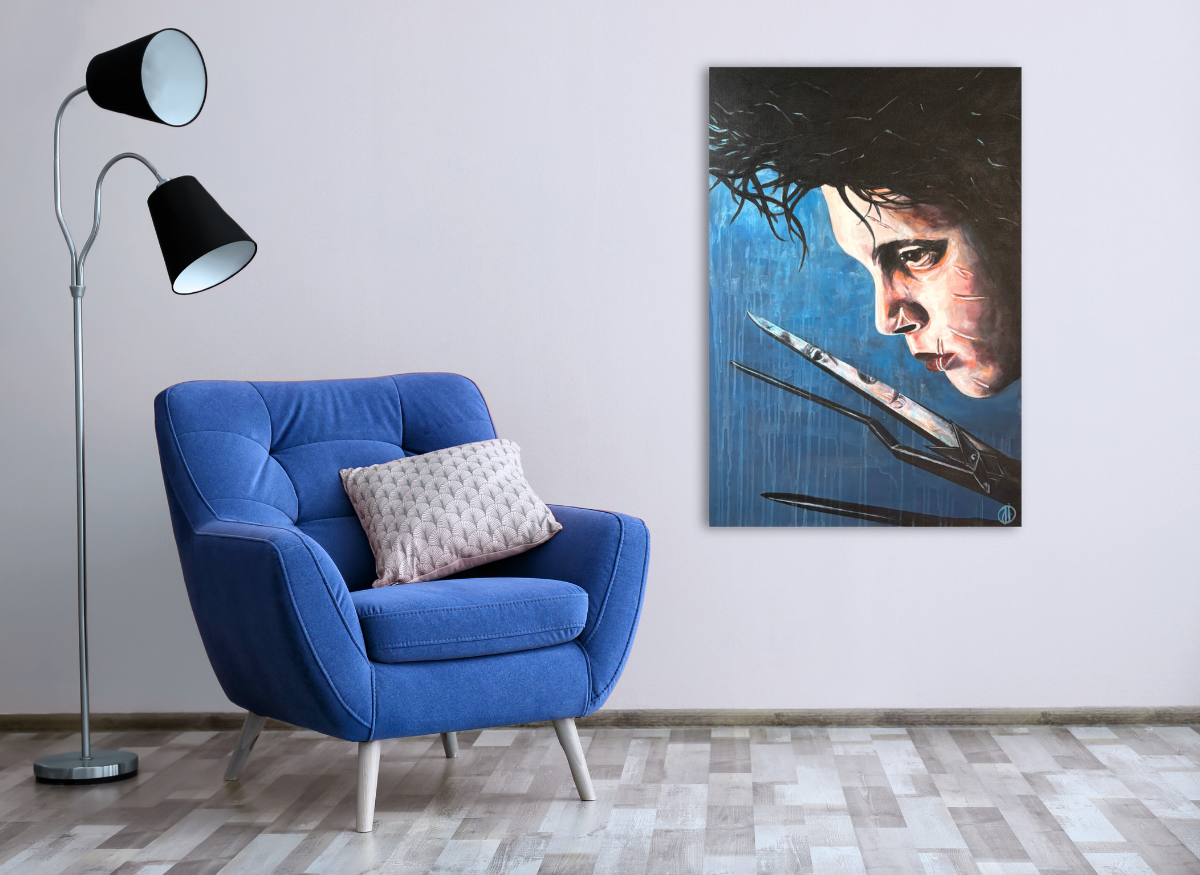Edward aux mains d’argent, capturé de profil sur un fond bleu nuit aux coulisses subtiles. Une image empreinte de douceur et de mélancolie, inspirée de l’univers poétique de Tim Burton.
