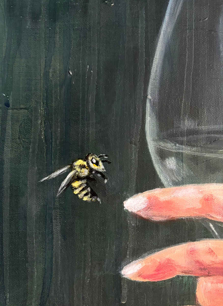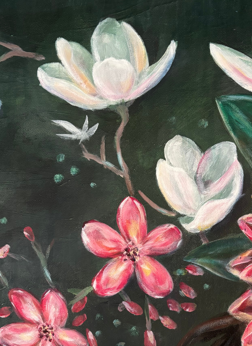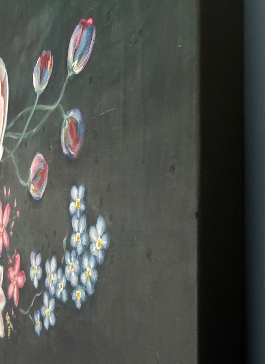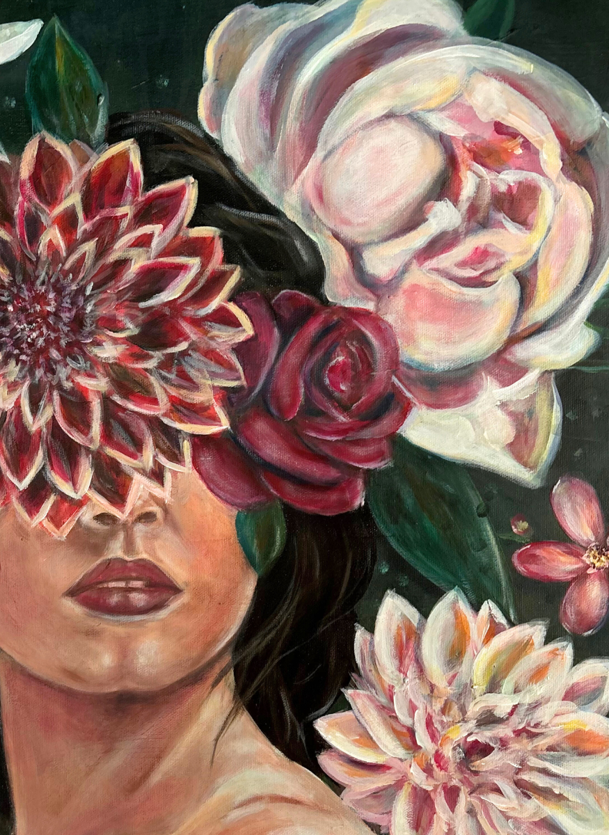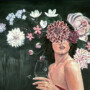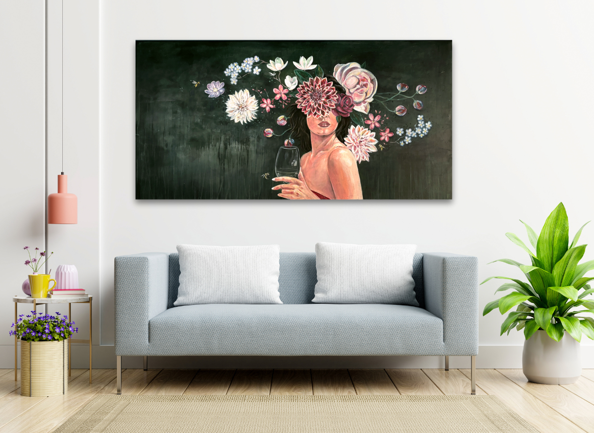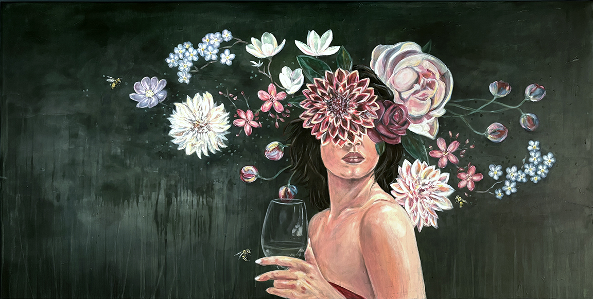 Le visage d’une femme se fond dans un jardin intérieur où pensées et émotions prennent la forme de fleurs éclatantes. Le fond feutré met en valeur la délicatesse de chaque détail : la peau, les pétales, le verre.