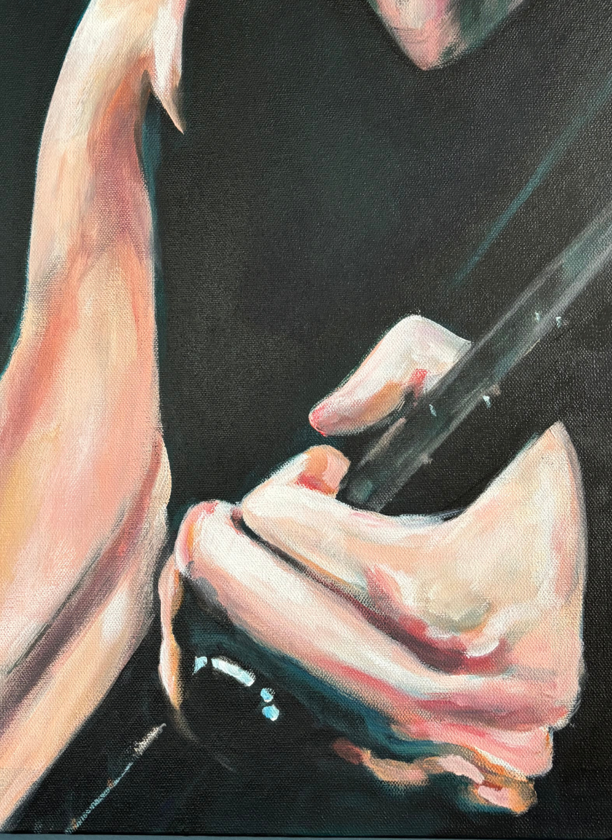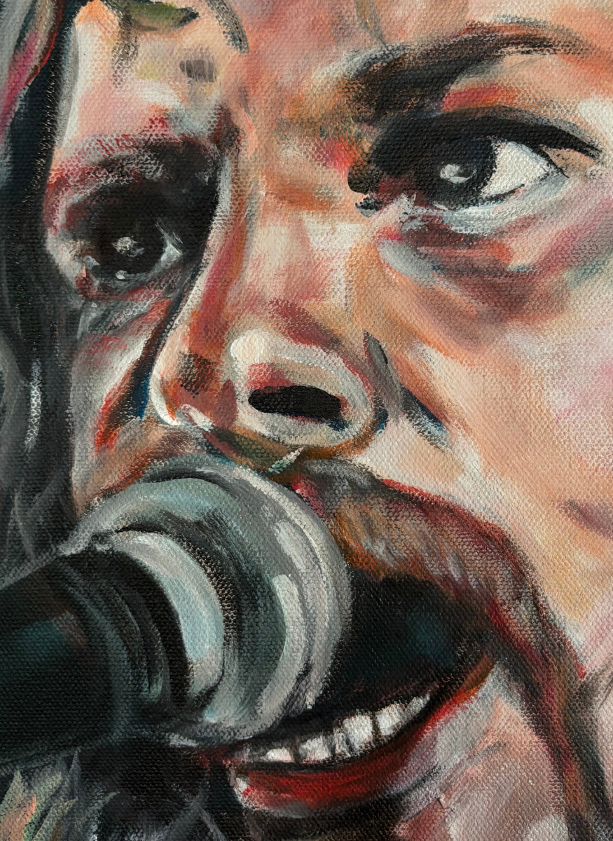 Un portrait de James Hetfield, capté dans une atmosphère intense et profonde. Les tons bleu-vert dominent la composition, apportant une force sobre et enveloppante, tandis que les touches d’orange créent un contraste vibrant qui attire le regard. La lumière et les ombres se répondent, mettant en valeur l’expression concentrée du musicien et toute la puissance de sa présence.