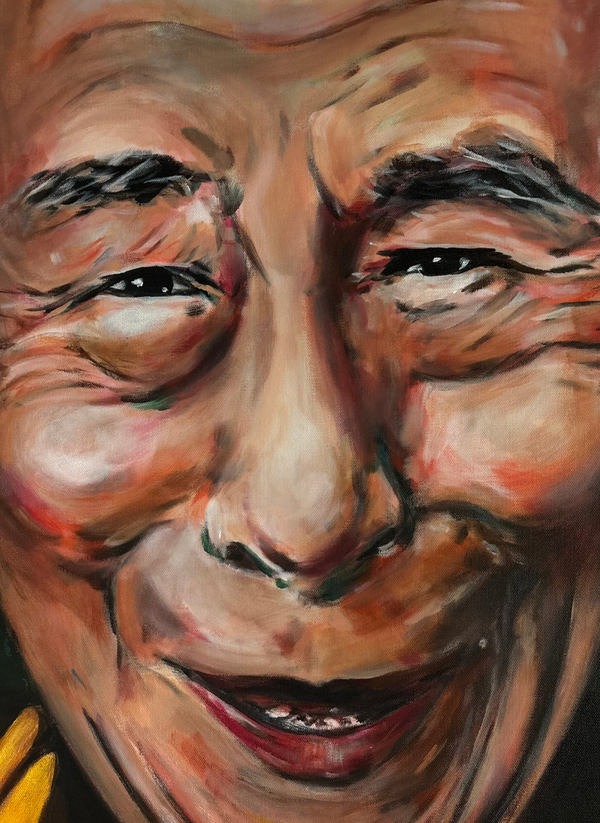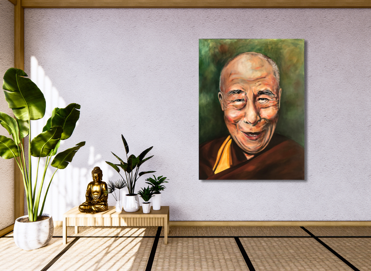 Son visage respire la paix, l’humour et la sagesse. Dans ce portrait, j’ai voulu capter l’essence lumineuse du Dalaï Lama, ce regard qui apaise, ce sourire qui réconforte. Une présence inspirante, peinte avec respect et humilité.