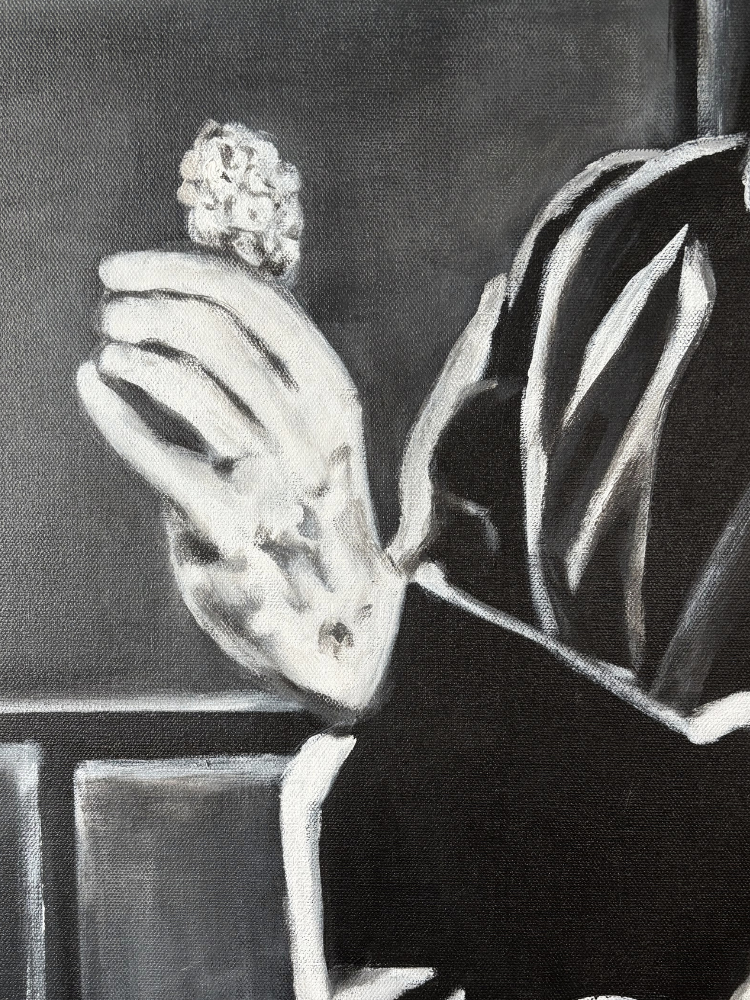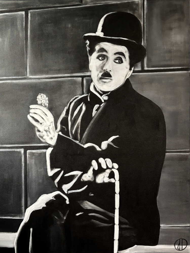 Inspirée du film Les Lumières de la ville (1931), cette œuvre met en scène le personnage emblématique de Charlot. Le contraste du noir et blanc met en valeur la simplicité du geste et la symbolique de la fleur, rappelant toute la poésie et l’humour subtils de Charlie Chaplin.