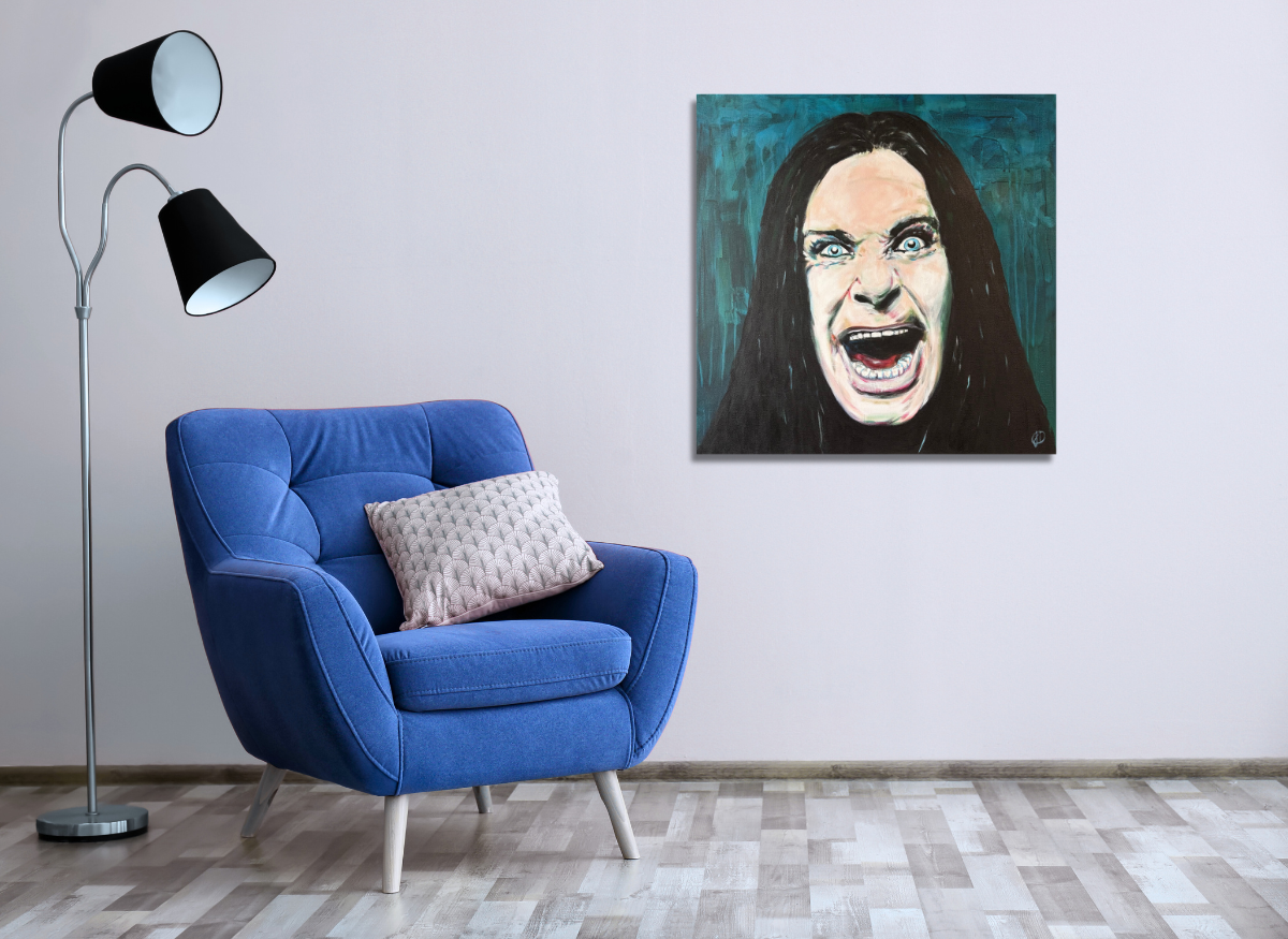 Un hommage vibrant à Ozzy Osbourne, figure mythique du rock et du heavy metal. Ce portrait intense et expressif capte toute la démesure de son personnage : regard halluciné, cri figé, présence électrisante. Peinte peu de temps après son décès, cette peinture se veut un clin d’œil respectueux à un artiste hors norme, qui a marqué des générations.