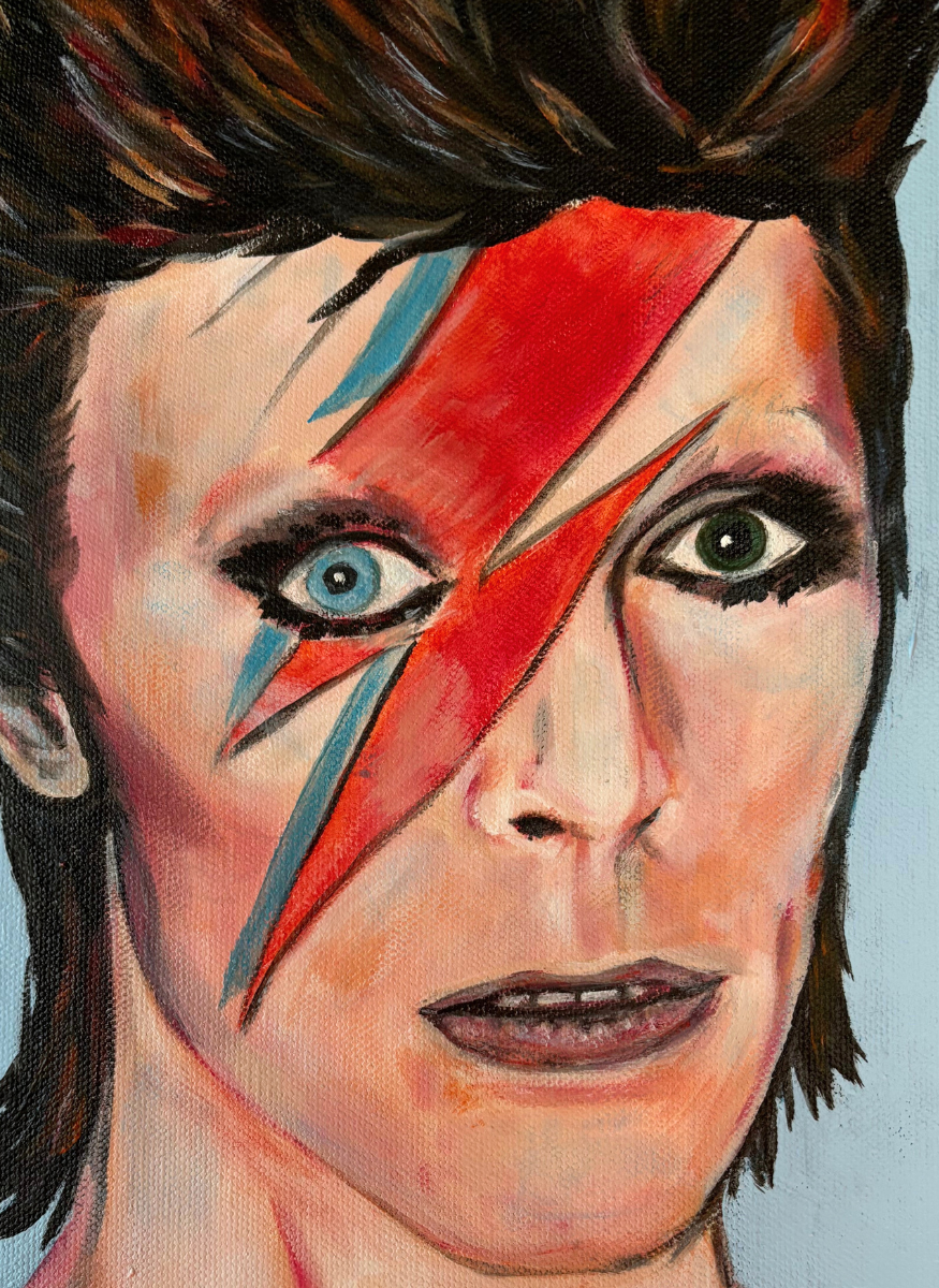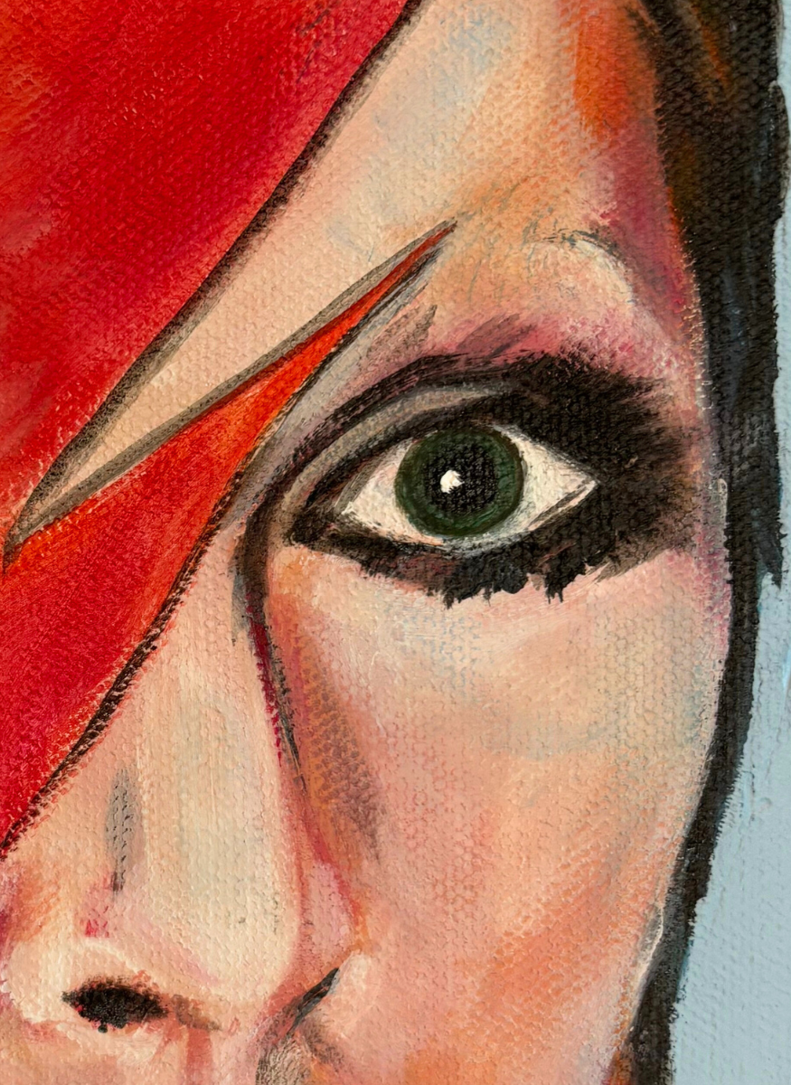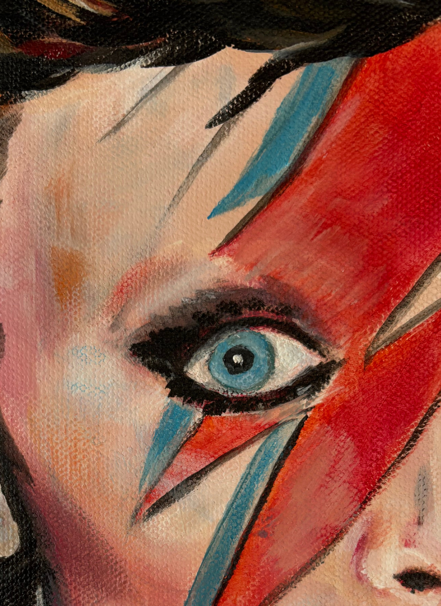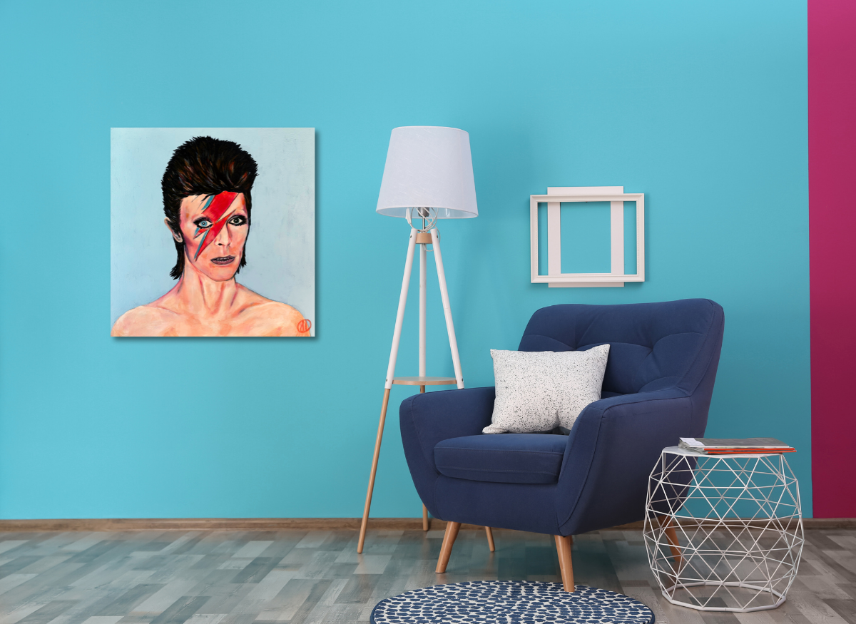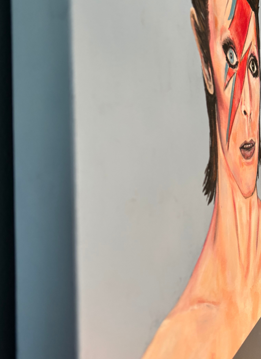 Un regard droit dans l’inconnu, une trace d’éclair sur le visage : cette toile revisite une image culte de David Bowie, incarnant toute l’audace de son alter ego Ziggy Stardust. Entre fragilité et puissance, elle capture l’esprit d’un artiste qui a toujours osé brouiller les codes. Une présence magnétique, hors du temps.